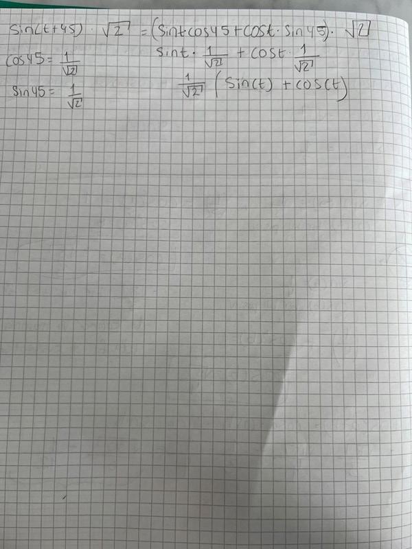 Jaha okej. Då tar roten ur 2 ut varandra vilket gör att man får svaret sin(t)+cos(t)