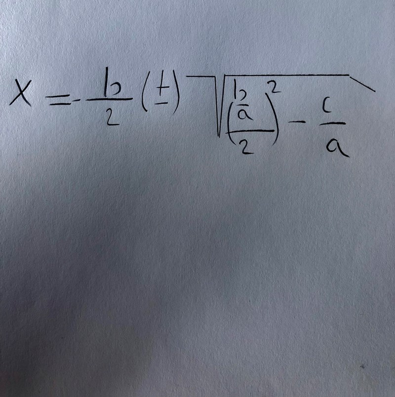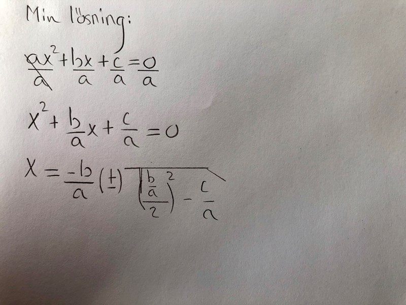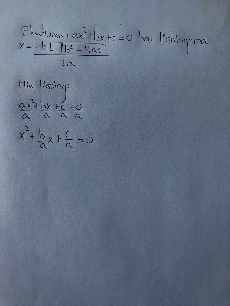 Vi börjar med ekvationen . Första steget är att del hela ekvationen med , vilket är tillåtet eftersom det inte vore en andragradsekvation om . Då får vi , d v s en andragradsekvation med samma rötter som den ursprungliga men med koefficienten för andragradstermen = 1. Vi vill kunna skriva denna ekvation på formen , för då kan vi dra roten ur båda led och sedan lätt få fram ett uttryck för x. Vi vet att (a+b)2=a2+2ab+b2, så vi försöker forma om vänsterledet så att det ser ut på det viset. Om vi börjar med att subtrahera c/a från båda sidor och förlänger koefficienten för x-termen med 2 får vi . Om vi hade haft en term också i vänsterledet, skulle vi kunna använda kvadreringsregeln baklänges och skriva den som en kvadrat - och eftersom man får göra vad som helst med en ekvation, bara man gör exakt samma sak på båda sidor, kan vi addera båda sidor med . Då får vi ekvationen . Här kan vi skriva om ekvationens vänsterled till . Om vi drar roten ur båda led får vi . Nu är vi nästan framme. Det enda som är kvar är att se till att få x ensamt på ena sidan, men det tror jag att du fixar själv.