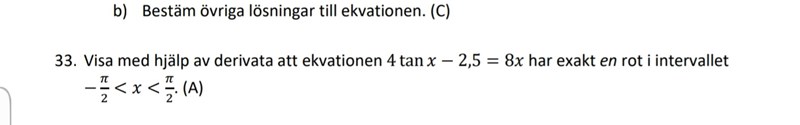 Behöver hjälp med denna uppgiften. Förstår inte hur derivatan hjälper mig bevisa att det bara finns en rot. För deriverar jag funktionen och sätter derivatan till noll får jag fram att inom de angivna intervallet finns två extrempunkter. Hur går jag vidare? Tacksam för hjälp.