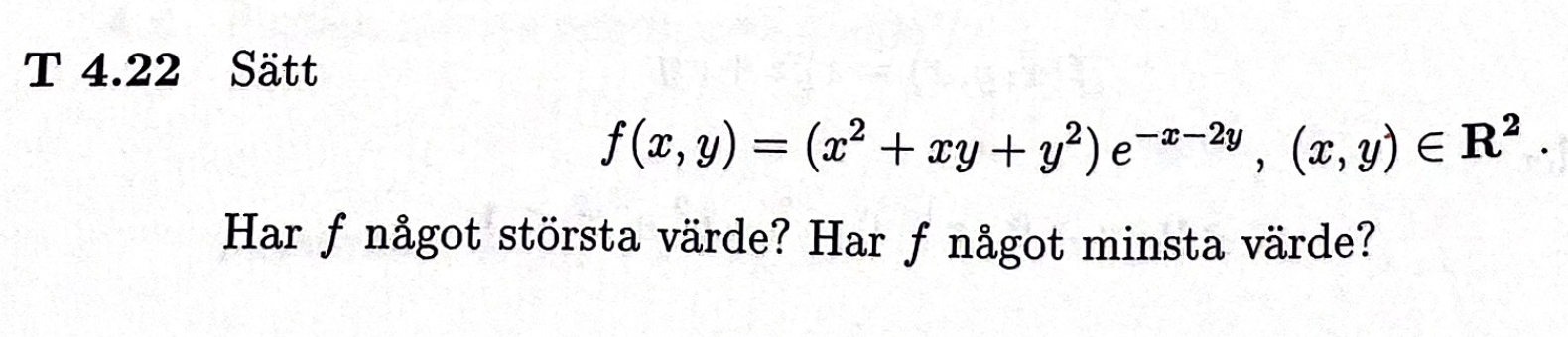 Hej, i den här uppgiften ska man visa om f(x,y) har en global minimum och/eller maximum värde. Det är enkelt att visa att den inte har ett maximum, då man tar: