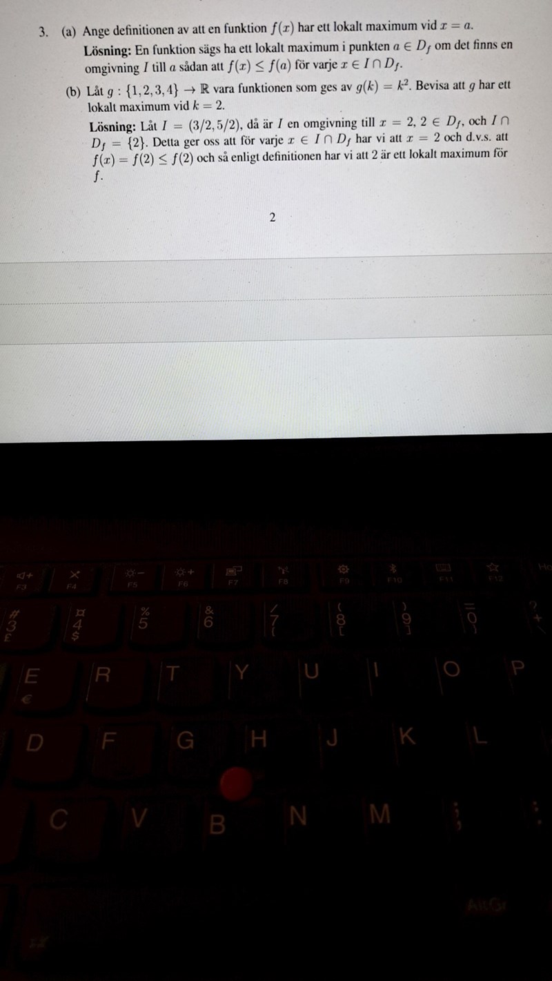 PATENTERAMERA skrev:I är ett öppet intervall som innefattar k = 2. I är en omgivning till k = 2. Det är tänkt att du skall komma på detta I själv. Idén är att det går att hitta ett intervall I sådant att k = 2 är det enda elementet i Df som ligger i intervallet. Det får till följd att inget element x som ligger i både I och Df får ett större funktionsvärde än f(2). Vi kan därför säga att f har ett lokalt max då k = 2.