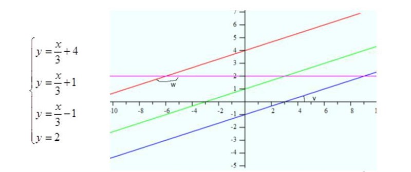 Du har fyra linjer som syns inritade i ett koordinatsystem här nedan. Bevisa att v+w=180°. Förklara och motivera varje steg.