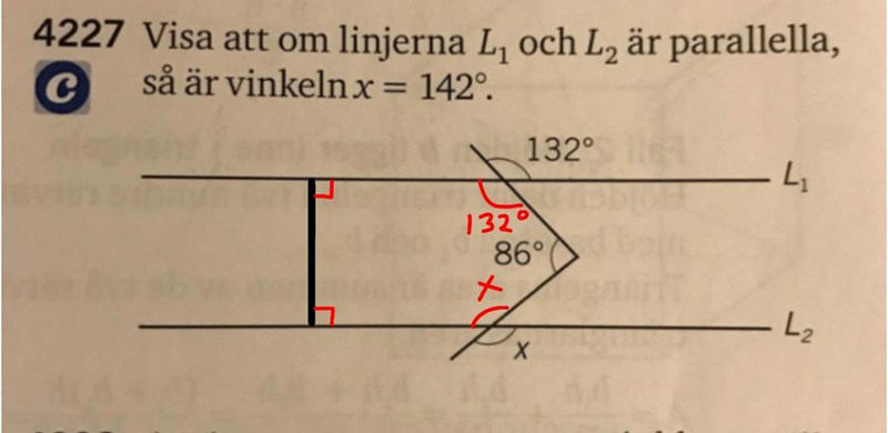 Jag får x = 132 . Hur ska x bli 142 grader? Bevisa gärna det för mig, är ni bussiga.
