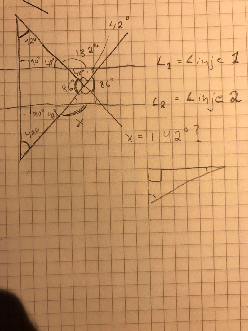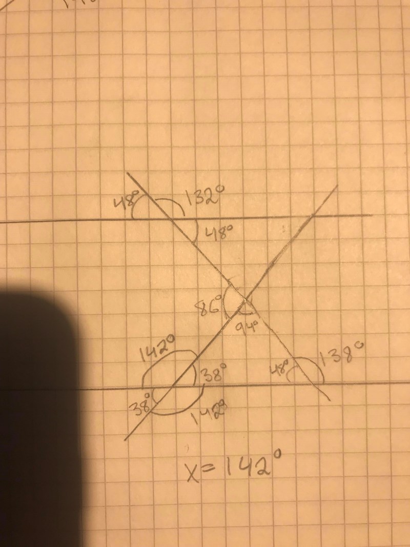 Ni ser mitt lite längre streck och att jag bestämt vinklarna i triangeln till 94 grader, 48 grader och 38 grader. Genom att dra det längre strecket fick jag likbelägna vinklarna i triangeln längst ned. Därifrån var det inte svårt att få 38 grader till vinkeln till vänster i triangeln och x = 142.