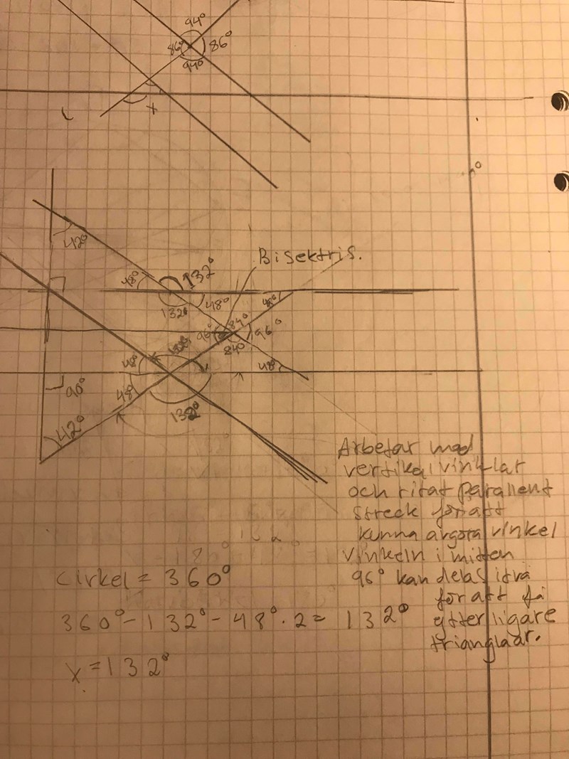 Detta kan jag konstatera genom att avgöra alternativ genom att se att likvärdiga vinkeln till 132 grader uppe i triangeln är det x är. Finns säkert fler sätt men jag jobbar gärna med alternatvinkel, likbelägen vinkel, sidovinkel och vertikal vinkel.