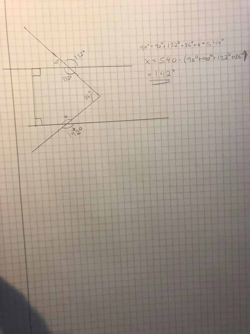 Jag har inte tid att skriva allt heller, hela hemsidan är buggig för mig. Förhoppningsvis bättre efter helgen. Se på min bild och de vinklar jag har med! Speciellt den vinkel som jag skrivit till 96 grader mot deras 86 grader. 86 grader / 2 = 43. 180 - 43 = 137 grader hade vinkel x blivit om jag haft 86 grader i mitten, och ursprungsfrågan vill ha vinkeln till 142 grader. Hoppas du förstår! Jämför ursprungsfrågans x och försök få det till 142 grader med givna fakta!