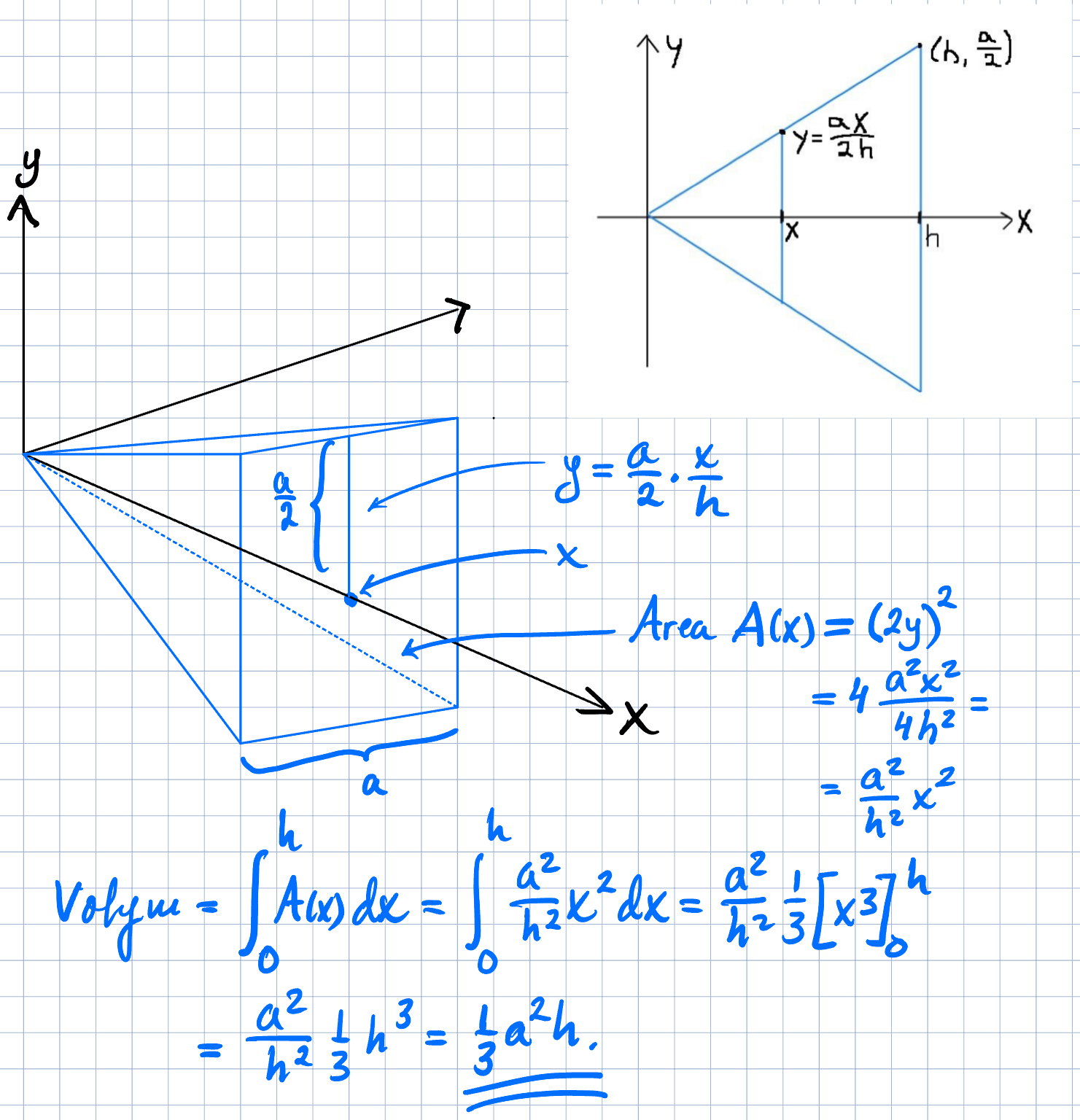 Koizenu skrev:Trinity2 skrev:Det är en 'summation' av kvadratskivorna A(x) * höjden dx = volymen.