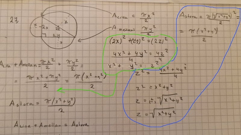 Summan av de mindre halvcirkelskivornas areor kan man trixa med pi och halvor; där får man k(x2+y2) för något k. Och den stora skivan är kz2 för samma k.