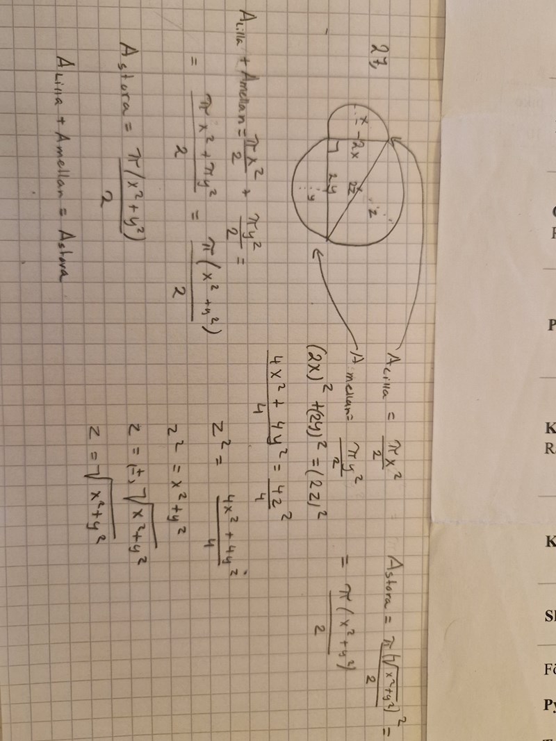 Triangeln är rätvinklig, alltså x2+y2 = z2 (sidorna är inte markerade i figuren men med litet fantasi fixar du det).