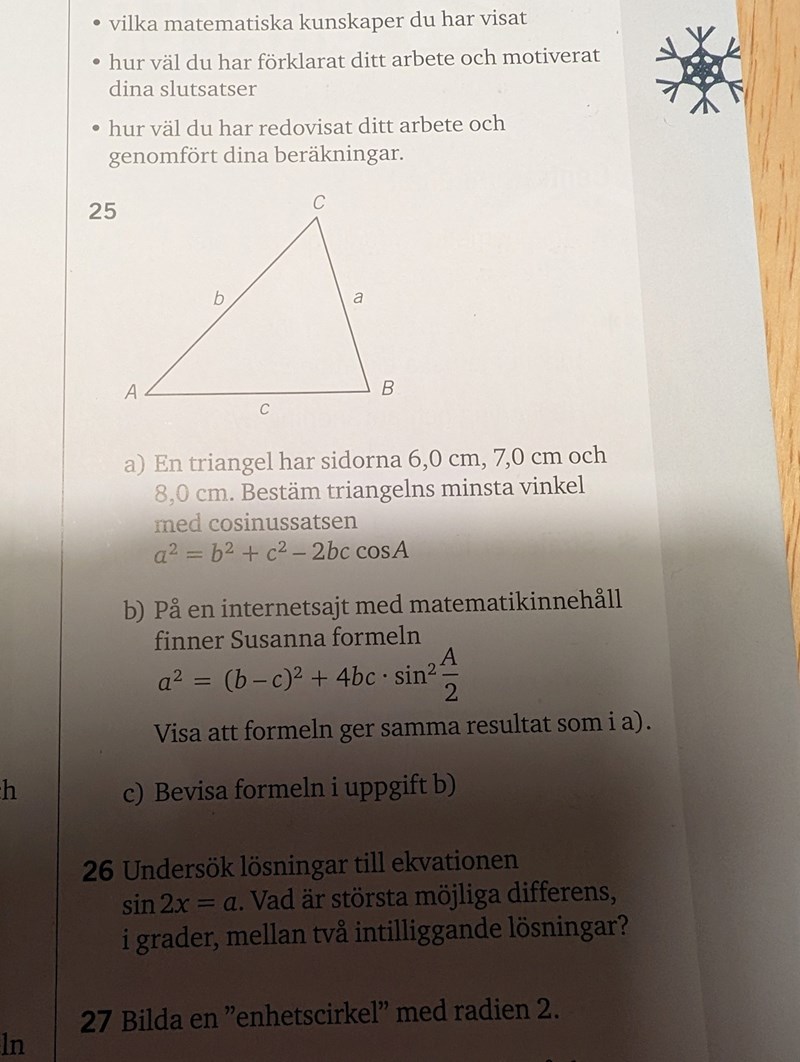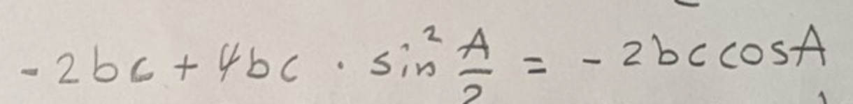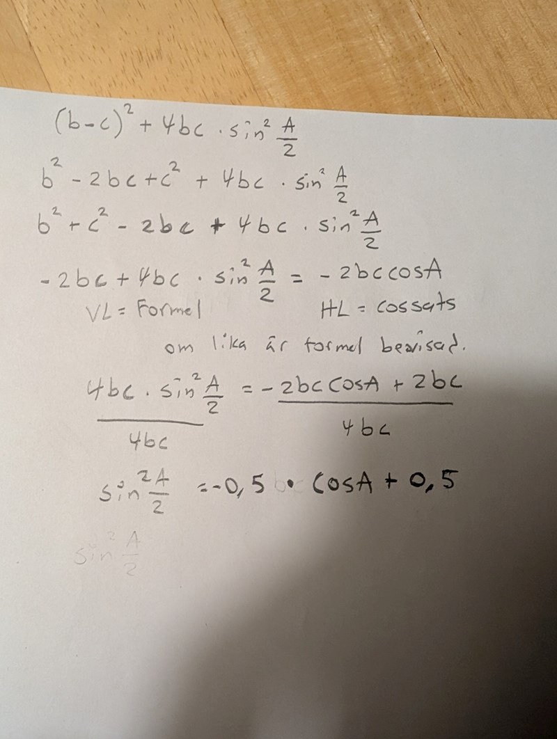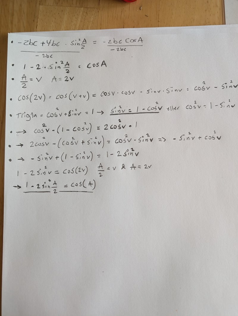 cos2v = 1-2sin^v och sen tänka då att A/2 = v och A=2v. Och sedan antar jag att jag ska ersätta cosA med detta i cosinussatsen och ta det därifrån.