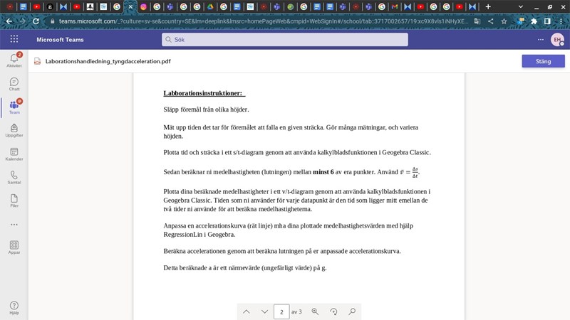 Efter att jag plottade in värderna på en vt-diagram fick jag på ett ungefär rät linje men k-värdet kommer inte bli i närheten av 9.82. Kurvan kommer väl bli helt tvärtom med en negativ lutning.