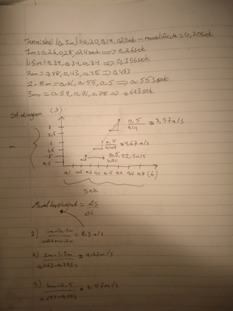 Ja förstår inte rikigt vad "n" står för. T.ex vid "t(n) och s(n)". Det jag gjorde var: Jag släppte bollen 3ggr och räknade ut medelvärdet. Sedan la jag till dem i ett diagram. Därefter - för att räkna ut medelhastigheten på av mätvärderna tog jag skillnaden på sträckan/tiden vilket på första var 10,86m/s osv.