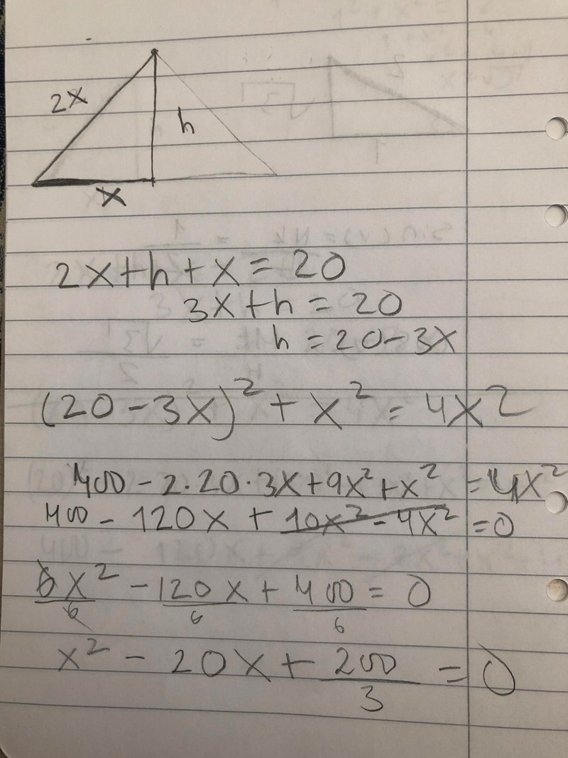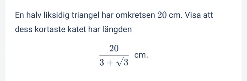 Om du fastnar på ett sätt, prova hitta ett annat. Till exempel kan du få h från Pythagoras sats och då stoppa den i formeln för omkretsen.