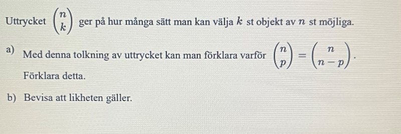 "n över p" antal sätt att välja ut p av dessa n objekt. När du gjort detta har du kvarlämnat n-p objekt (som vi INTE valde). Det är alltså samma sak som att säga "Välj ut n-p objekt att lämna kvar".