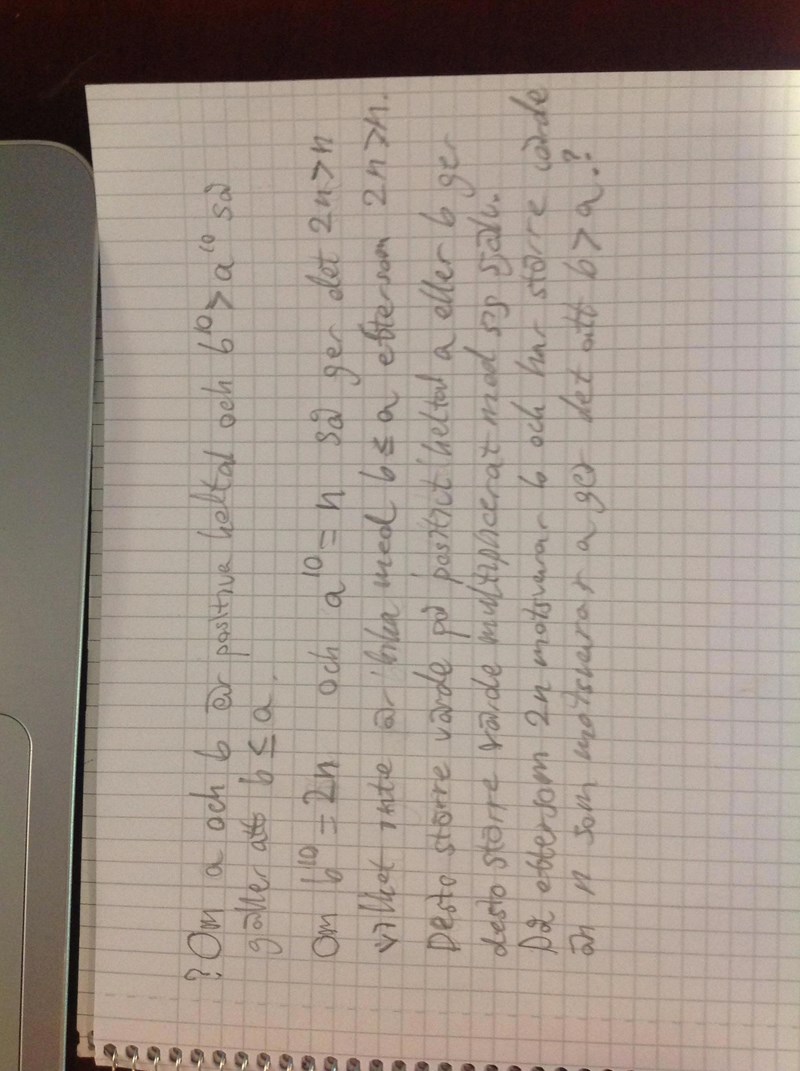 Kan jag göra på följande sätt: Anta att om a och b är positiva (reella) heltal och a^10>a^10 så gäller att ba.