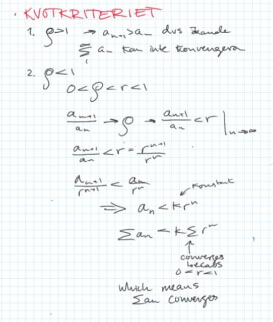 Hej jag kollar på ett klipp på youtube där dom förklarar beviset för kvotkriteriet men det är i ett steg som jag inte riktigt hänger med. Det är det steget dom går från an+1rn+1<anrn till att an<k·rn Kan ni hjälpa mig förstå. Detta var videon jag kollade på: https://www.youtube.com/watch?v=rUis1mSzwyA