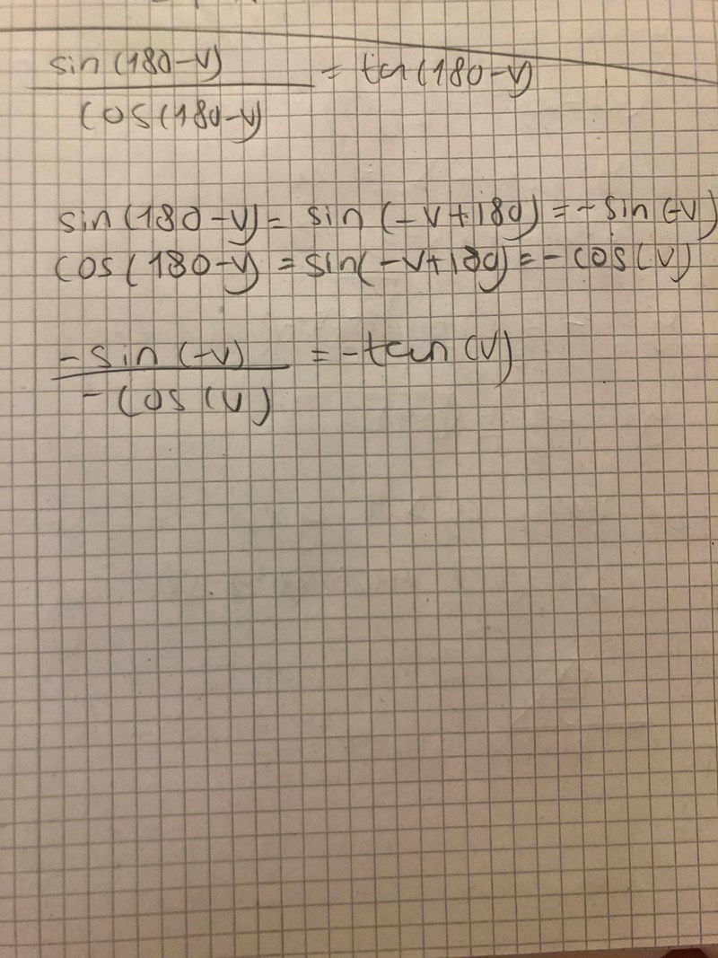 Vad är du förvirrad över? Sin(180-v) = Sin(v), cos(180-v)=-Cos(v), kvoten blir sin(v)/-cos(v)=-tan(v). Det är väl det du skrivit? :)