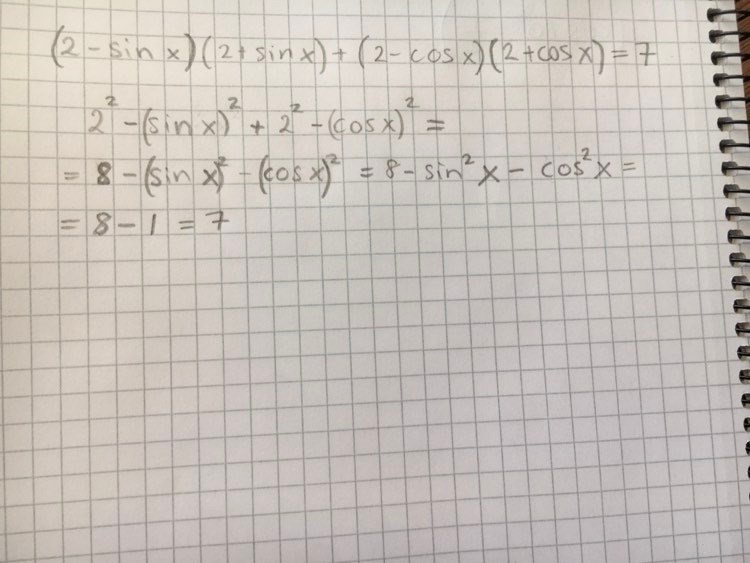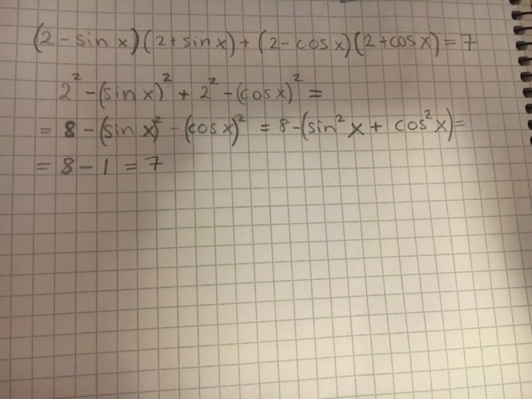 Uppgiften lyder : Visa att (2-sin x)(2+sin x) + (2-cos x)(2+cos x)= 7