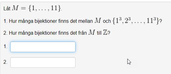 1. Mängderna har båda 11 element. Hur många bijektioner finns det mellan två mängder med 11 element? För att göra det enklare kan du börja med att tänka igenom hur många bijektioner det finns mellan mängder med 2, 3, 4… element.