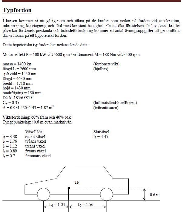 120 km/h = 33,3m/s Luftmotstånd= 435N Drivkraft=641N Effekt=21,3kW Moment=204Nm