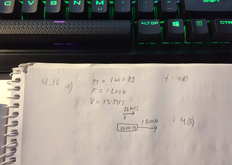 "Bilen rör sig med 13 m/s och sedan verkar en kraft på bilen i 4 s och efter att dessa fyra sekunder förflutit kommer bilen att ha en ny hastighet. Det är denna nya hastighet som man frågar efter."
