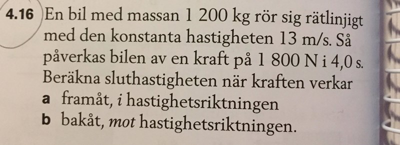 Korra skrev:AlvinB skrev:Bilen rör sig med och sedan verkar en kraft på bilen i och efter att dessa fyra sekunder förflutit kommer bilen att ha en ny hastighet. Det är denna nya hastighet som man frågar efter.