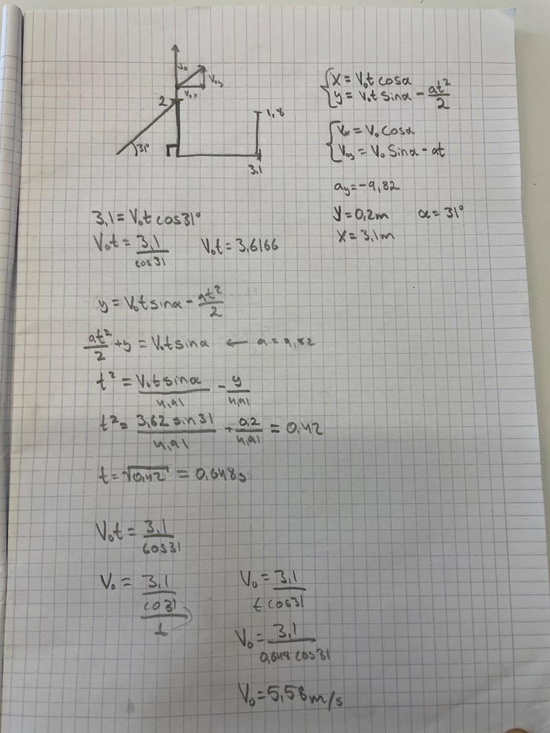 Hej Yngve! Jag gjorde på ett annat sätt nu. Eftersom jag vet att x=3,1 m och y=-0,2 meter använder jag formlerna -0,2= v0tsin31° °-1/2gt2 och 3,1=v0ttcos31° och fick v0t=3,1/cos31° som jag sedan stoppade in i -0,2= v0tsin31° °-1/2gt2. Sedan stoppade jag in g som 9,82 och löste ekvationen och fick t som jag sedan använde i v0t=3,1/cos31° och fick v=5,6 m. Stämmer det?