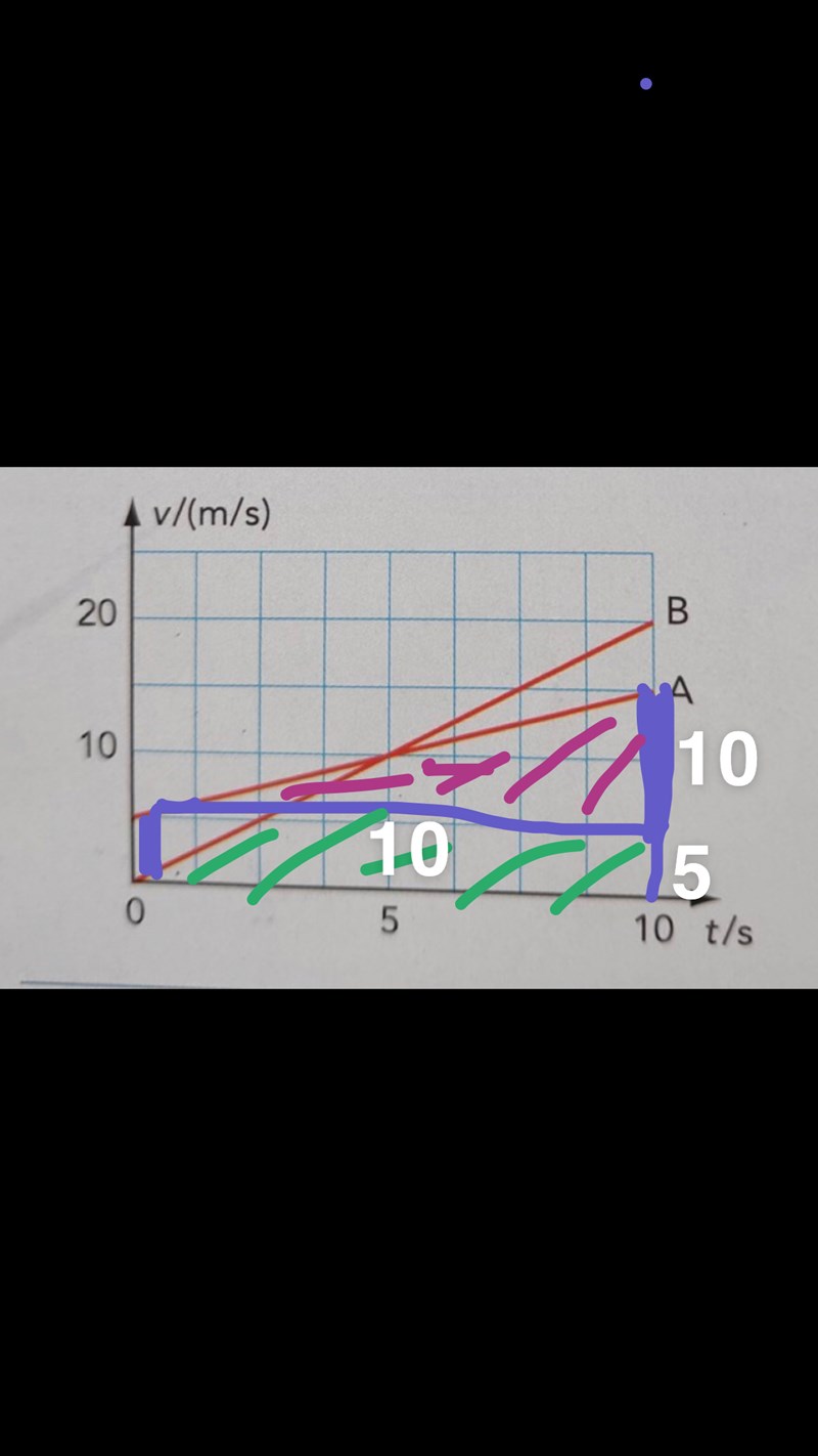 Arean för A består dels av en rektangel med höjden 5 m/s och bredden 10 sekunder och dels en triangel med höjden15-10 = 5 m/s och basen 10 m. Hur stor är summan av dessa båda areor?
