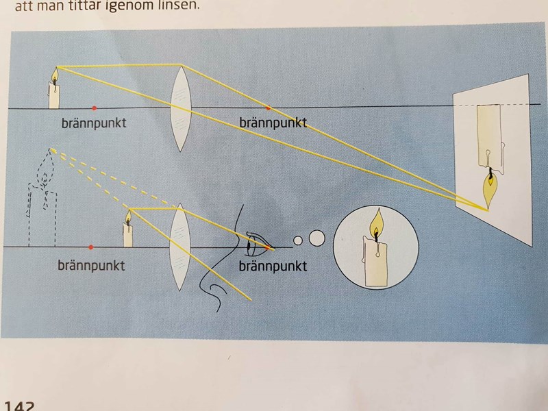 Hej, jag försöker förstå mig på det här med hur en bild uppstår genom en konvex lins. Varför är det ritat två gula streck från ljuset i exemplet nedan? (både från det övre ljuset, och det undre större ljuset?
