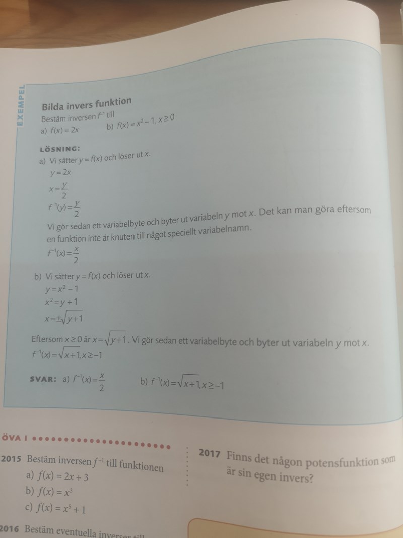 MathematicsDEF skrev:beerger skrev:MathematicsDEF skrev:När han tar fram en inversfunktion av en funktion så byter definitionsmängden och värdemängden plats, dvs definitionsmängden för f blir istället värdemängden för För att ta fram en invers så löser man för den oberoende variabeln (x) och sedan byter plats på f(x) och x.