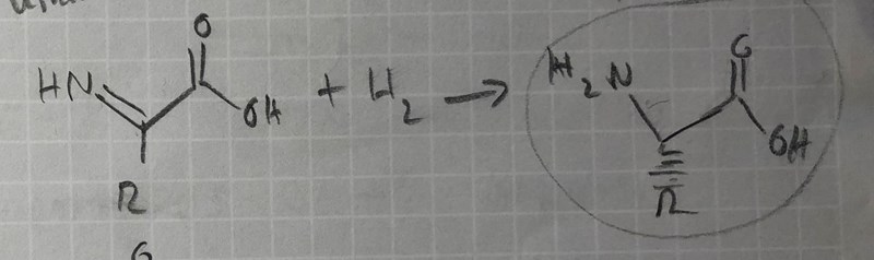 Varifrån kommer reaktionsformeln? Den verkar ofullständig - det ser ut att fattas ett väte i produkten, det borde sitta nere vid R ungefär. Och i vilket sammanhang skulle man vilja låta en aminosyra reagera med vätgas?