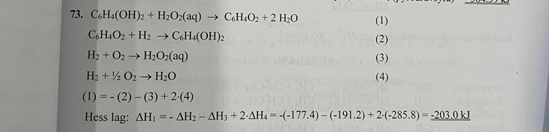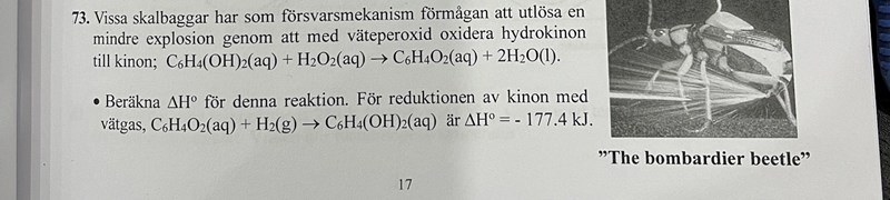 det jag inte förstår med facits svar är var ifrån de får bildningsentalpin för kinon, och varför de inte räknar med det i deltaH?