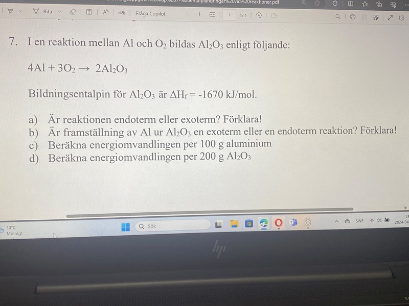 min fråga gäller del C. Varför delar man bildningsentalpin med 2 om det är 4 mol Al?