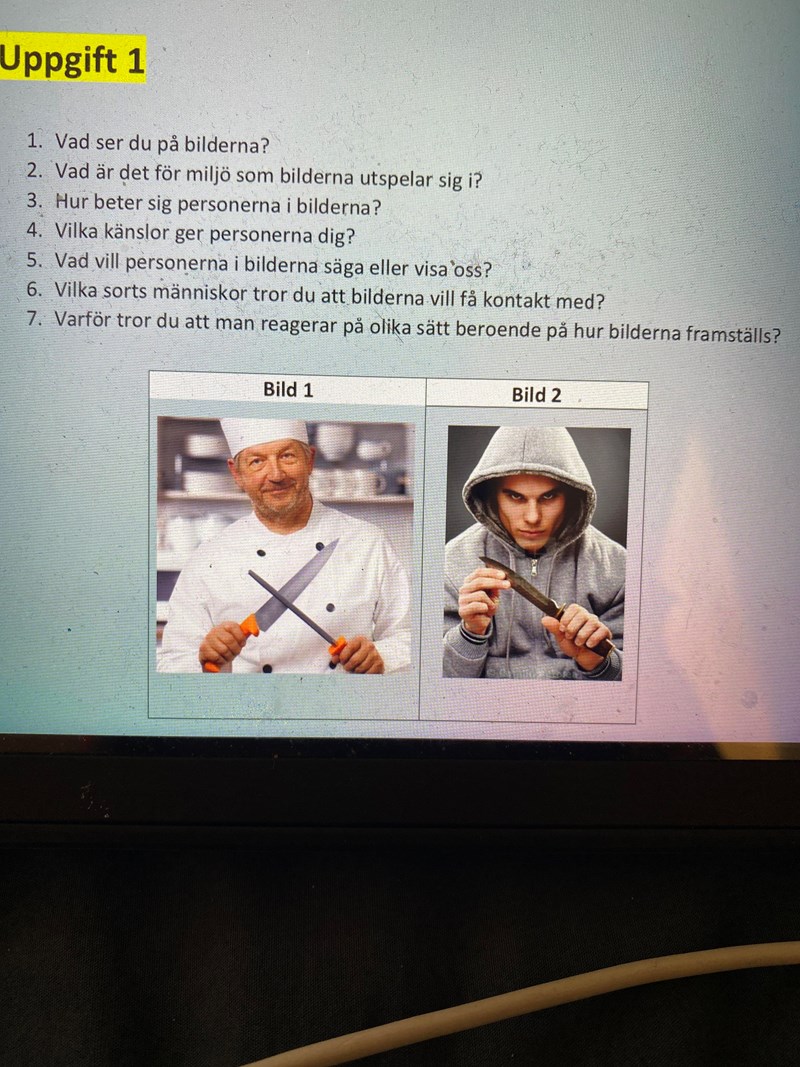 Fråga sex frågar vilka grupper som bilderna riktar sig till. Bild ett har en kock på bilden, så den kanske riktar sig mot andra kockar och restauranggäster (eller andra som köper kockens mat). Vem riktar sig bild två till?