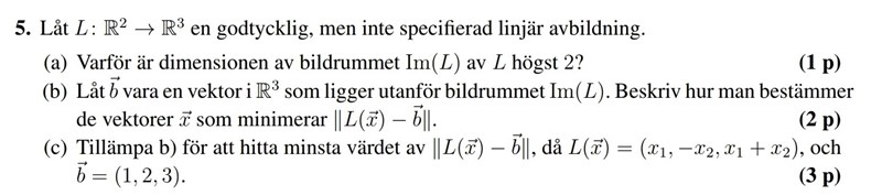 Du vill då hitta den vektor i planet som ligger närmast vektorn b, d.v.s att normen av vektorn L(x) - b är så liten som möjligt.
