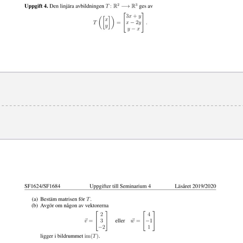 Ingen aning hur man löser den här typen av frågor, hur gör man? Och vad är im(T)? Vad är bildrum? Och vad menar man egentligen när de säger att jag ska bestämma en matris för T?