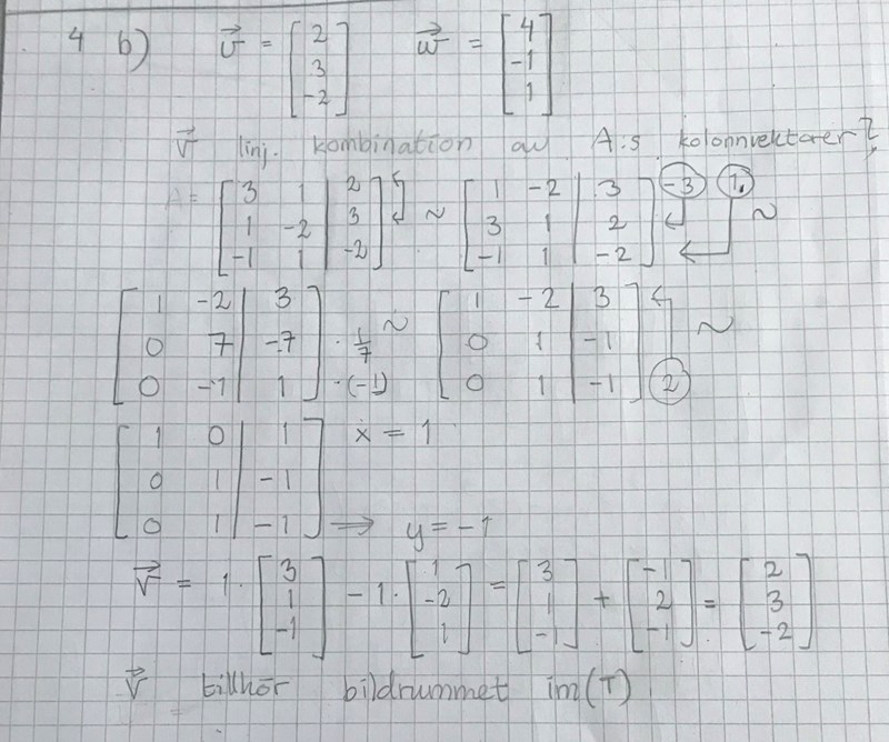Stämmer lösningsmetoden? Och skrev jag linjärkombinationen på korrekt sätt? Ser att linj. Komb. Stämmer för vektor v men när man svarar, skriver man så?