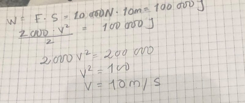 Bilen väger 2000 kg och bromsar med bromskraften 10 kN. Bromssträckan blir 10 m. Vad var bilens hastighet innan inbromsningen?