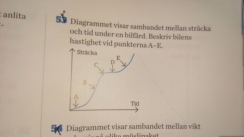 A- Bilen går långsam i en jämn takt eftersom lutningen är låg och det visar bilen går långsam och linjen är rakt det visar att bilen går i en jämntakt.