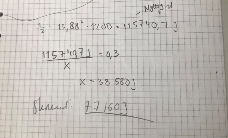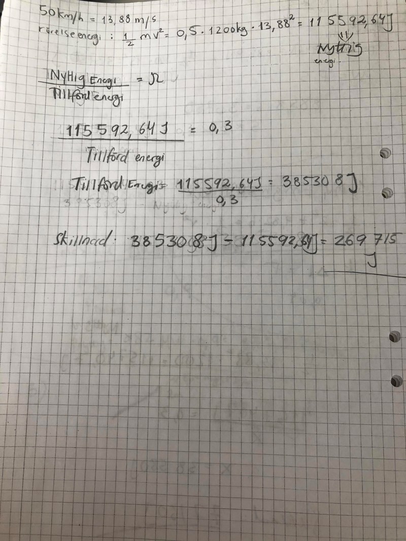Du borde skriva mer. 50 km/h motsvarar 50/3,6 = 13,88 m/s. Nyttig energi är lika med rörelseenergin när bilen har nått hastigheten 50 km/h.