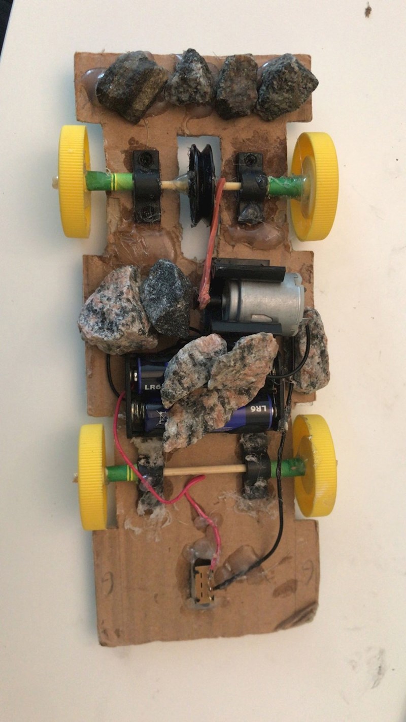 Tyngden av de fastlimmade stenarna i bakändan kommer lyfta framändan lite. Det blir en vridningpunkt runt bakaxeln.