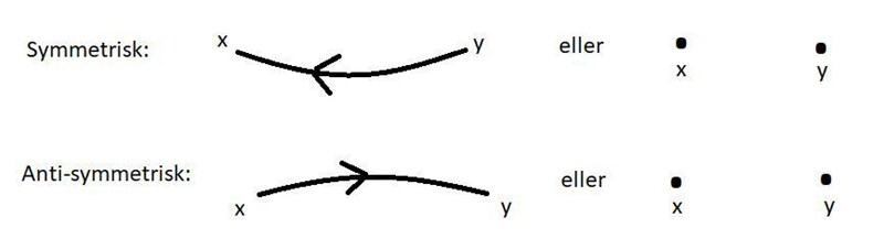 Anti-symmetrisk: Om x är relaterad till y och y är relaterad till x så följer det att x=y.