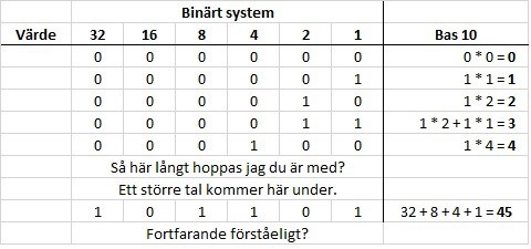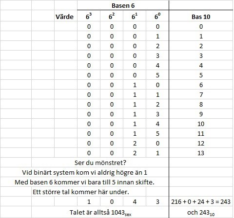 Om du nu har knäckt koden till hur just dessa tal uttrycks i de olika baserna så kan vi generalisera lite så att du ser att mönstret är detsamma oavsett bas:
