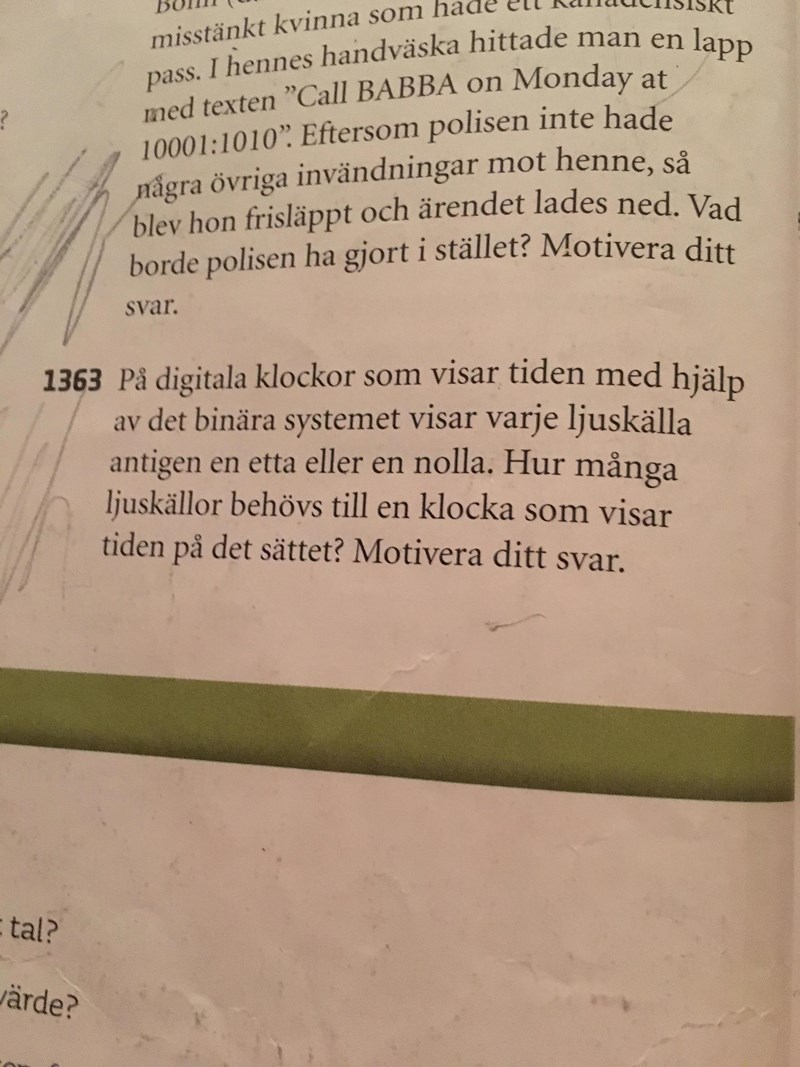 - 24 olika tal för timmar (0-23). Hur många binära siffror (lampor) behöver du för det?