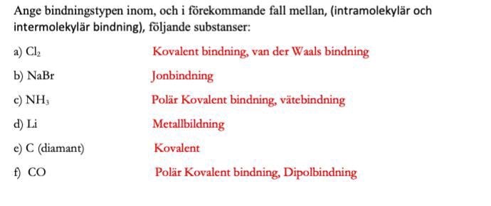 Olika atomer ger polär kovalent bindning ger polär kovalent bindning inom molekylen. (c,f). Om det finns väteatomer som sitter på F, O eller N blir det vätebindning mellan olika molekyler (förklarar c) och om ämnet är en dipol utan sådana väteatomer blir det dipol-dipolbindning (förklarar f).