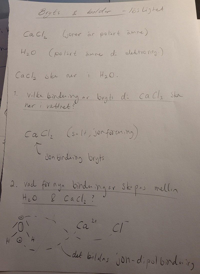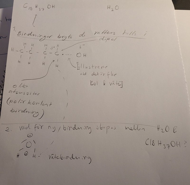Vid 1 på båda så visar jag vilka bindningar som bryts då vatten (polärt lösningsmedel ingår med de andra ämnena).