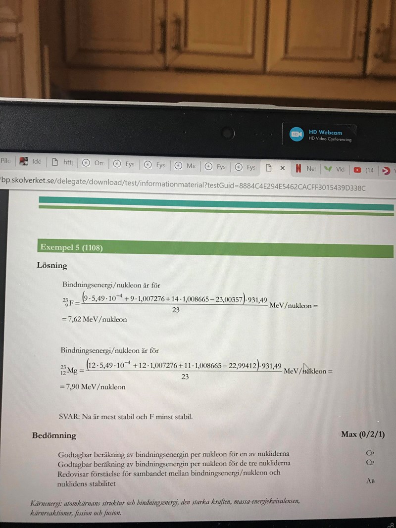 Det är det som händer i beräkningen: atomen har 9 elektroner (massa u), 9 protoner (massa u) och 14 neutroner (massa u). Dra bort den uppmätta massan 23.00357 u. Omvandla den kvarvarande massan till energi med Einsteins formel (1 u motsvarar 931.49 MeV), och sedan snittas energin ut över de 23 protonerna och neutronerna.
