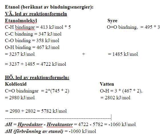 Etanol: C2H5OH+ 3 O2→ 2 CO2+ 3 H2O+ energi (ΔH = -1367 kJ)
