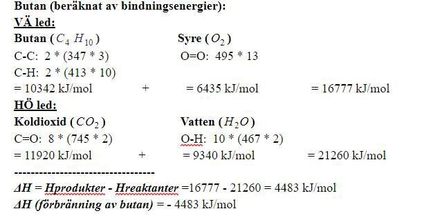 2. Vi tar som exempel min beräkning av butan. Om jag skulle räkna butan och syre med hjälp av bindningsenergier sen ta värdena för koldioxid och vatten från en tabell med bildningsentalpier, skulle man få fel värde då?