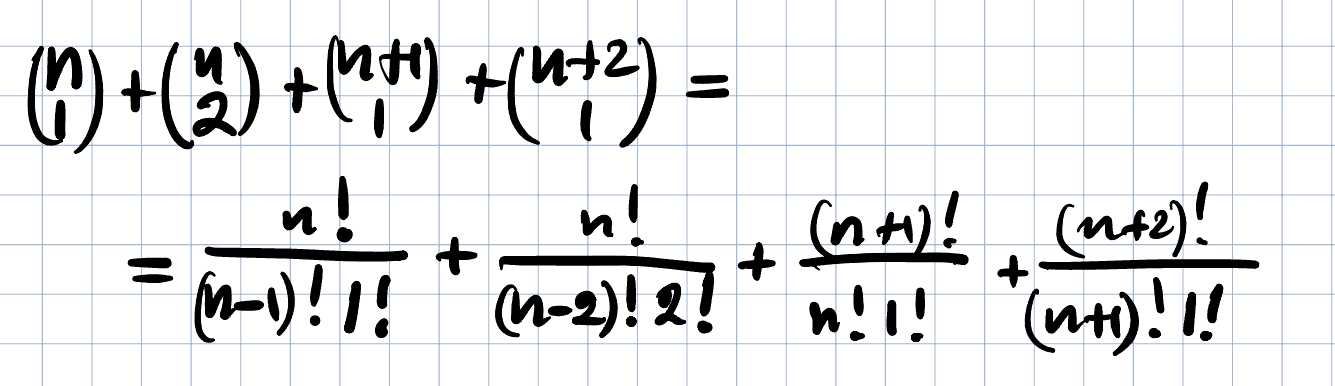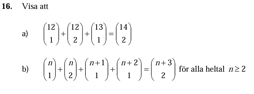 På fråga a) har jag försökt räkna ut VL för sig och se om det blir som i HL, men jag får fel svar. Jag tar nPr(12,1) nPr(12,2) och nPr(13,1) enskilt och adderar ihop de, men det blir inte nPr(14,2). Har även försökt att utveckla förenkla VL men kommer inte så långt. Hur ska jag göra?